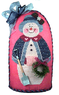 Sally is stitched on luscious cranberry ice linen and includes lots of unique embellishments. She has a jaunty plaid flannel hat bow topped with a snowflake charm, sparkly beads and tiny buttons on her cape, fuzzy pink muff and a mini show shovel, complete with greenery wreath and bow. We stitched Sally with over-dyed threads and included conversions and finishing instructions. Warm up your needle with this sweet snow-woman!